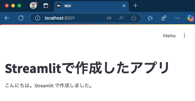 import streamlit as st st.title('Streamlitで作成したアプリ') st.write('こんにちは。Streamlit で作成しました。')