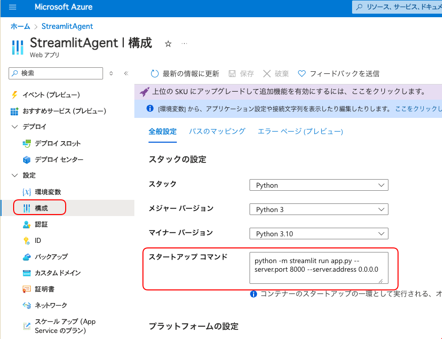 Pythonサーバーを起動するため、構成で起動コマンドを設定します。